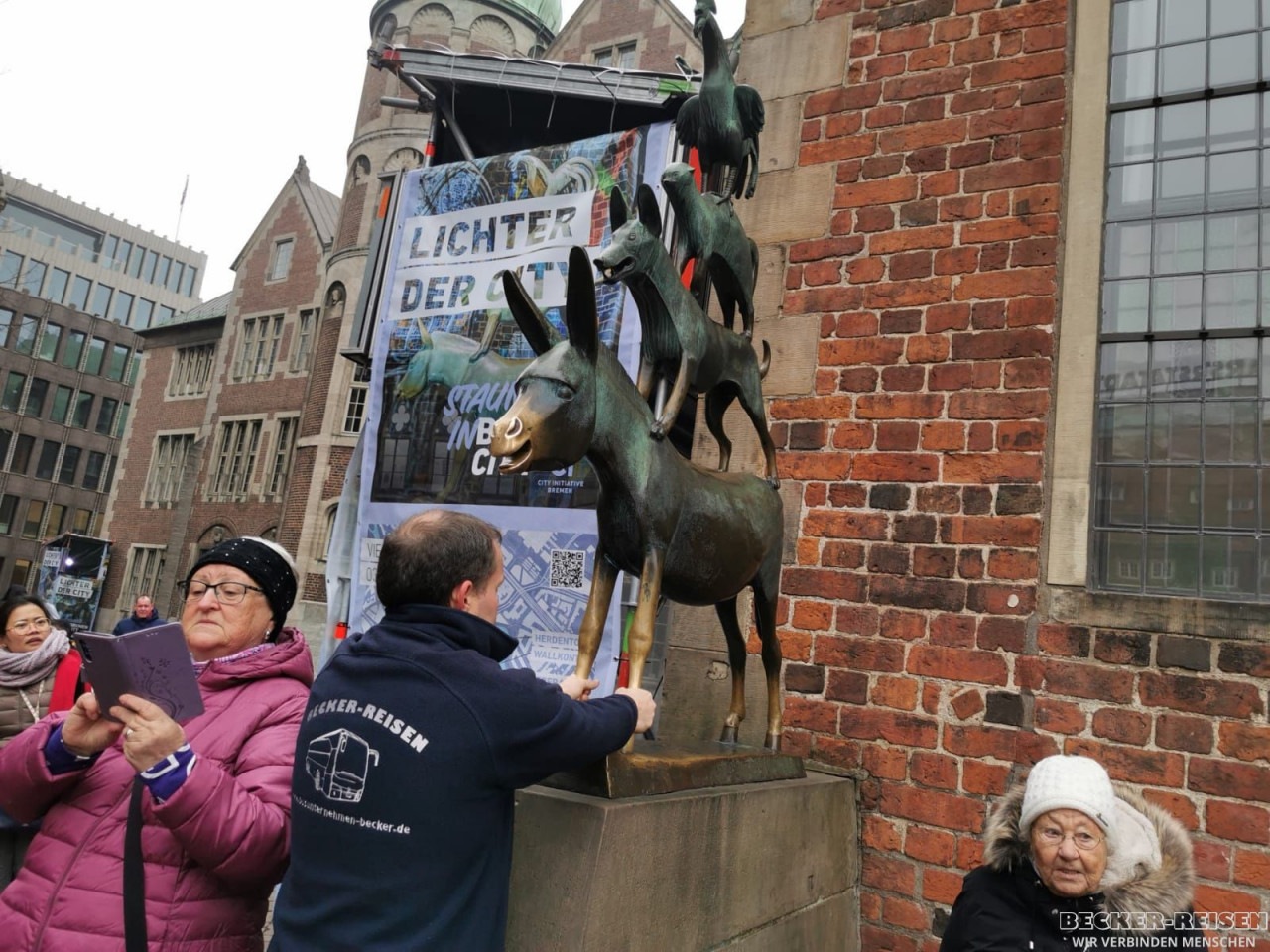 Sonntag: Stadtrundgang und StadtrundfahrtDer Sonntag begann mit einem reichhaltigen Frühstück, das uns bestens für den bevorstehenden Tag stärkte. Mit einer örtlichen Reiseleitung entdeckten wir die schönsten Ecken Bremens. Ein Stadtrundgang führte uns durch die historische Altstadt mit dem imposanten Roland, dem Rathaus und dem pittoresken Schnoor-Viertel. Natürlich durften die Bremer Stadtmusikanten auf unserer Tour nicht fehlen.