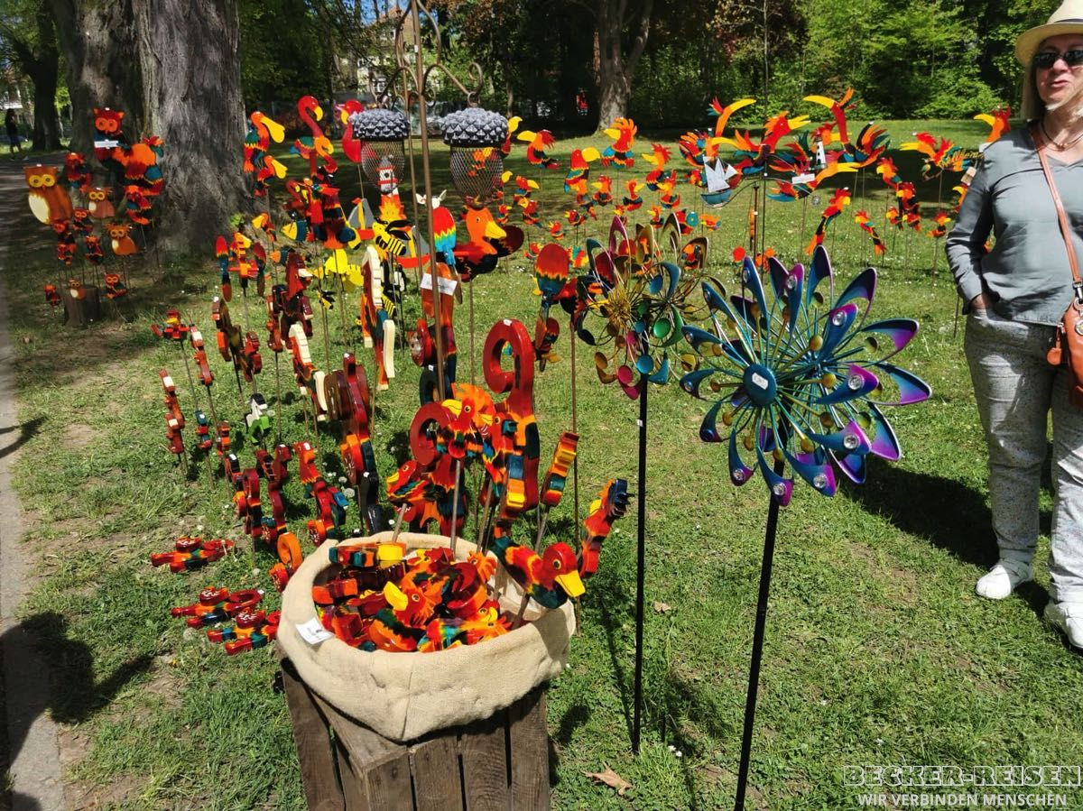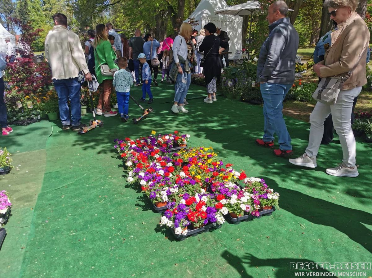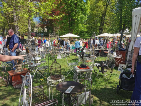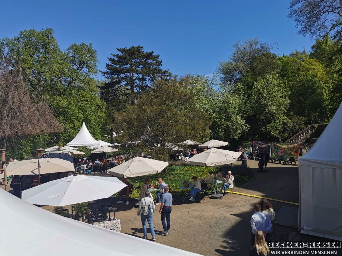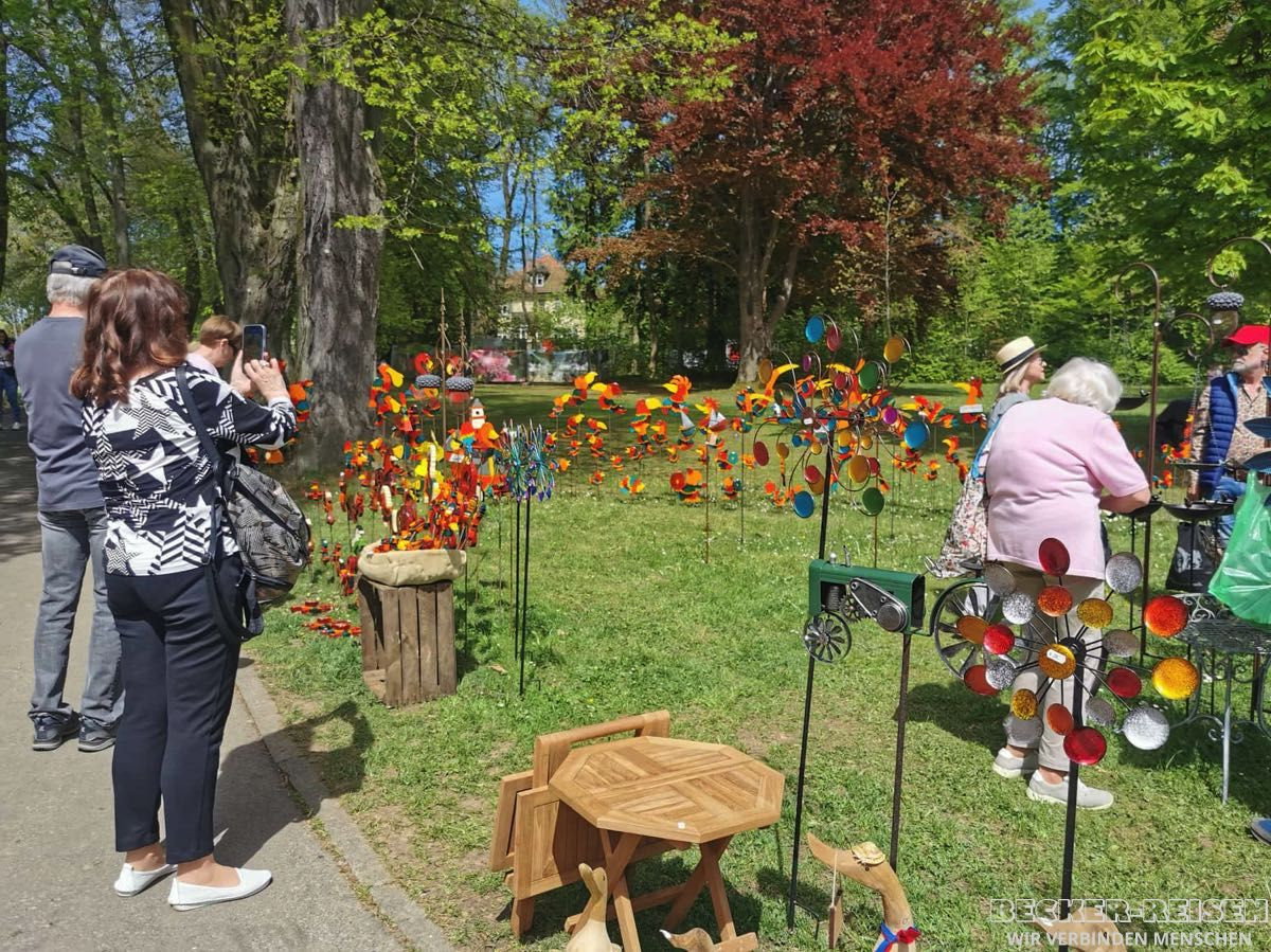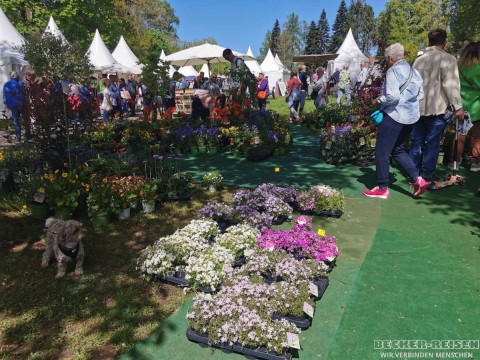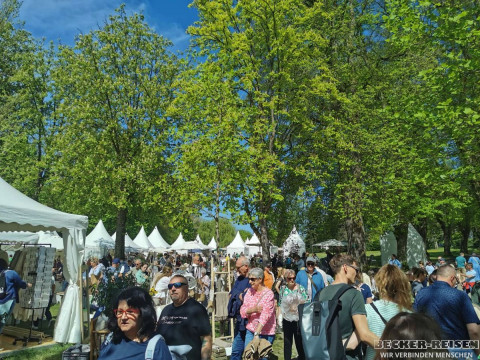 Unsere Reisegäste schlenderten entspannt über das Gelände, tauschten Tipps mit Gärtnern, genossen Kaffee und Kuchen im Schlosscafé oder ruhten sich im Schatten alter Bäume aus. Viele fanden besondere Mitbringsel – ein kunstvoll gefertigter Windfänger, ein außergewöhnlicher Rosenstock oder einfach eine neue Idee für den eigenen Balkon.
