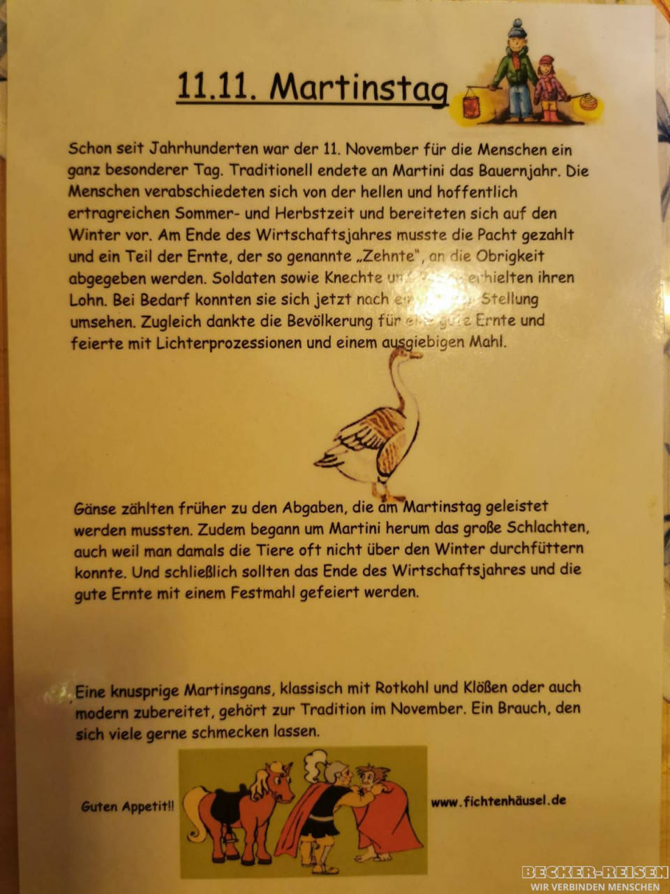 Am 11. November ist es soweit: der Martinstag, an dem traditionell die Martinsgans auf den Tisch kommt! Auch dieses Jahr lädt Becker Reisen zum beliebten Martinsgansessen ins malerische Fichtenhäusel bei Bärenstein im Erzgebirge ein. Dieses Erlebnis verbindet eine herbstliche Genussreise mit einem entspannten Ausflug in die wunderschöne Natur des Erzgebirges.