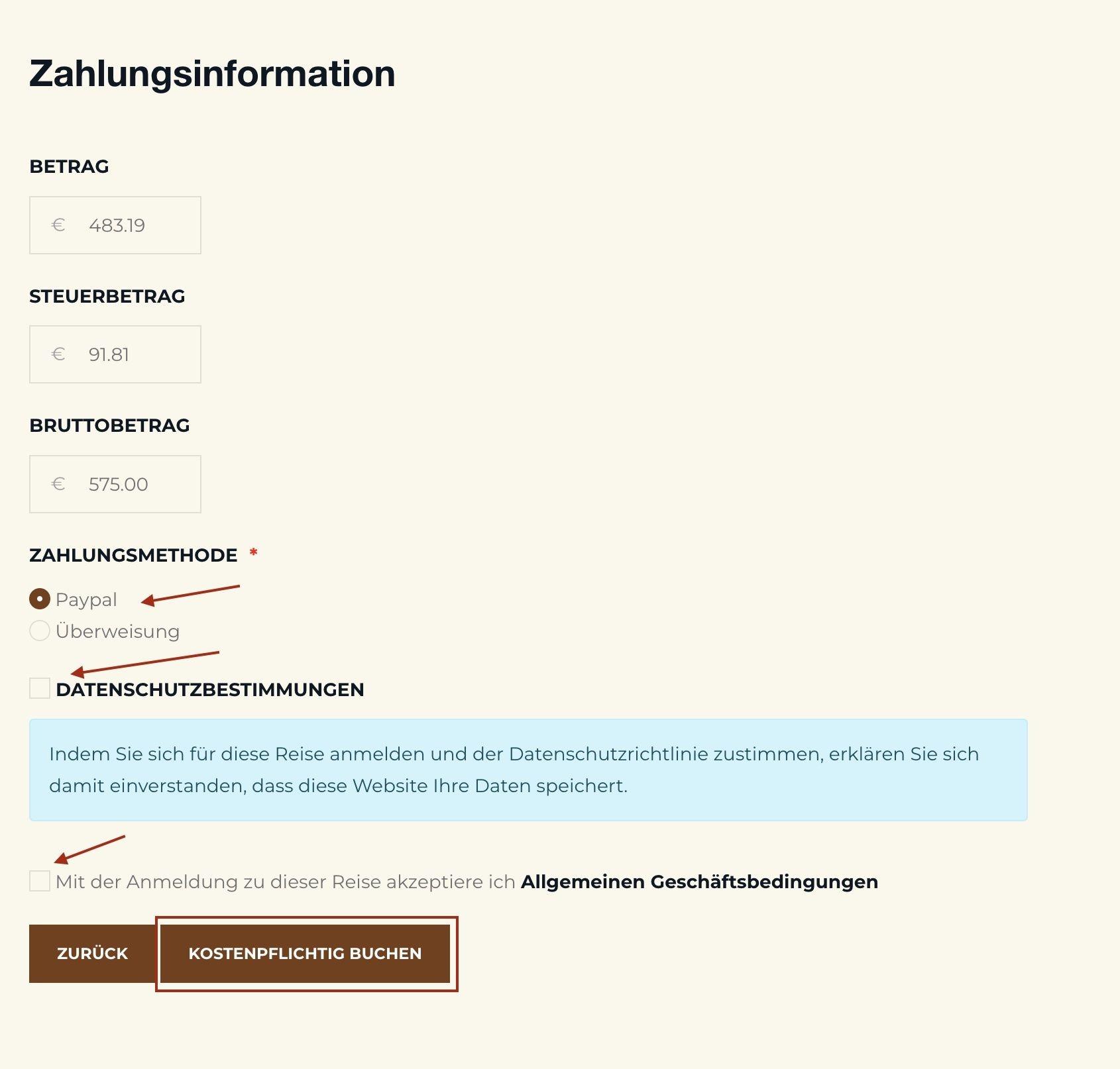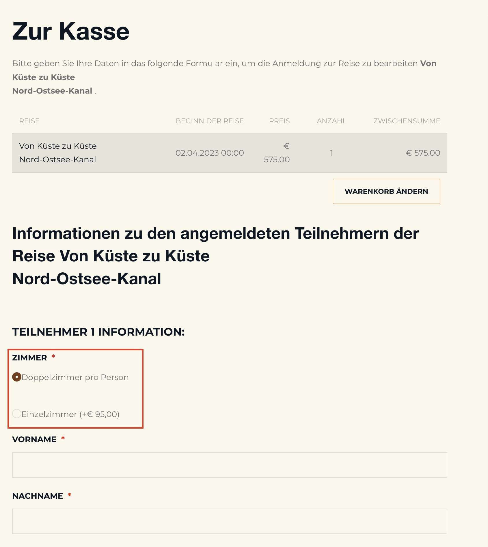 Es öffnet sich ein Fenster, der Warenkorb. Hier sehen Sie Ihre Buchung. An dieser Stelle können Sie auch die Anzahl der Personen, für die Sie buchen möchten, kostenpflichtig verändern.
