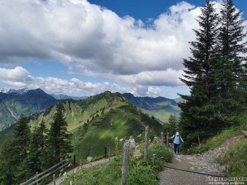 Ein idealer Ort zum Verweilen, Staunen, Fotografieren. Dann machten wir uns zu Fuß auf den Weg hinab nach Mittelberg. Der Abstieg führte über sanfte Pfade, vorbei an Almen, durch Wälder und sonnige Hänge.