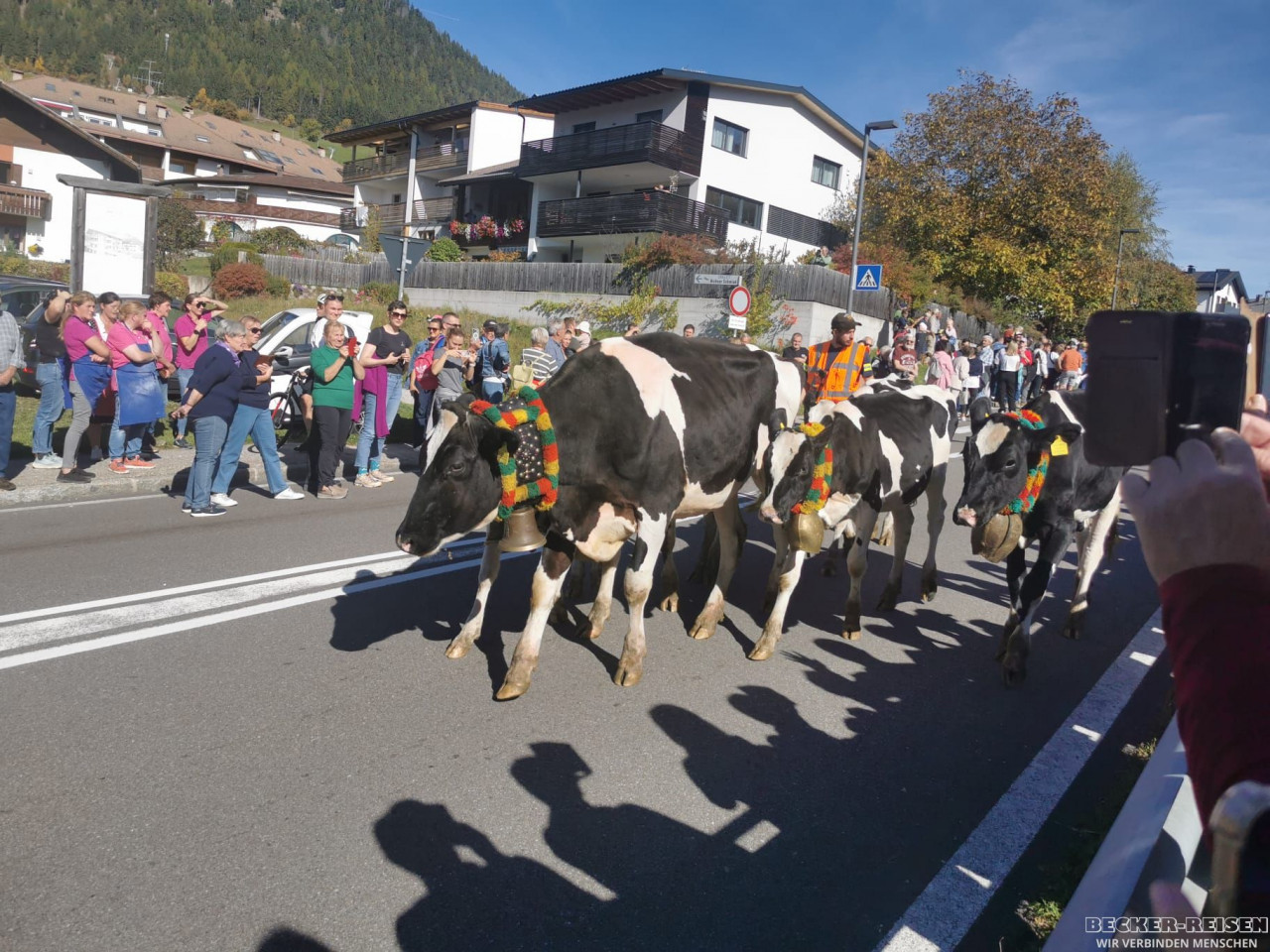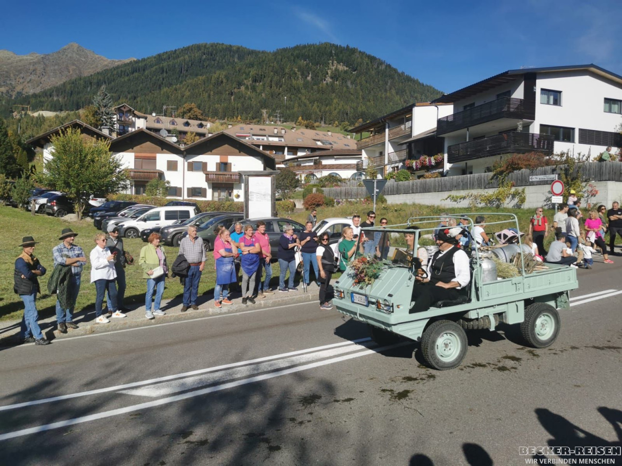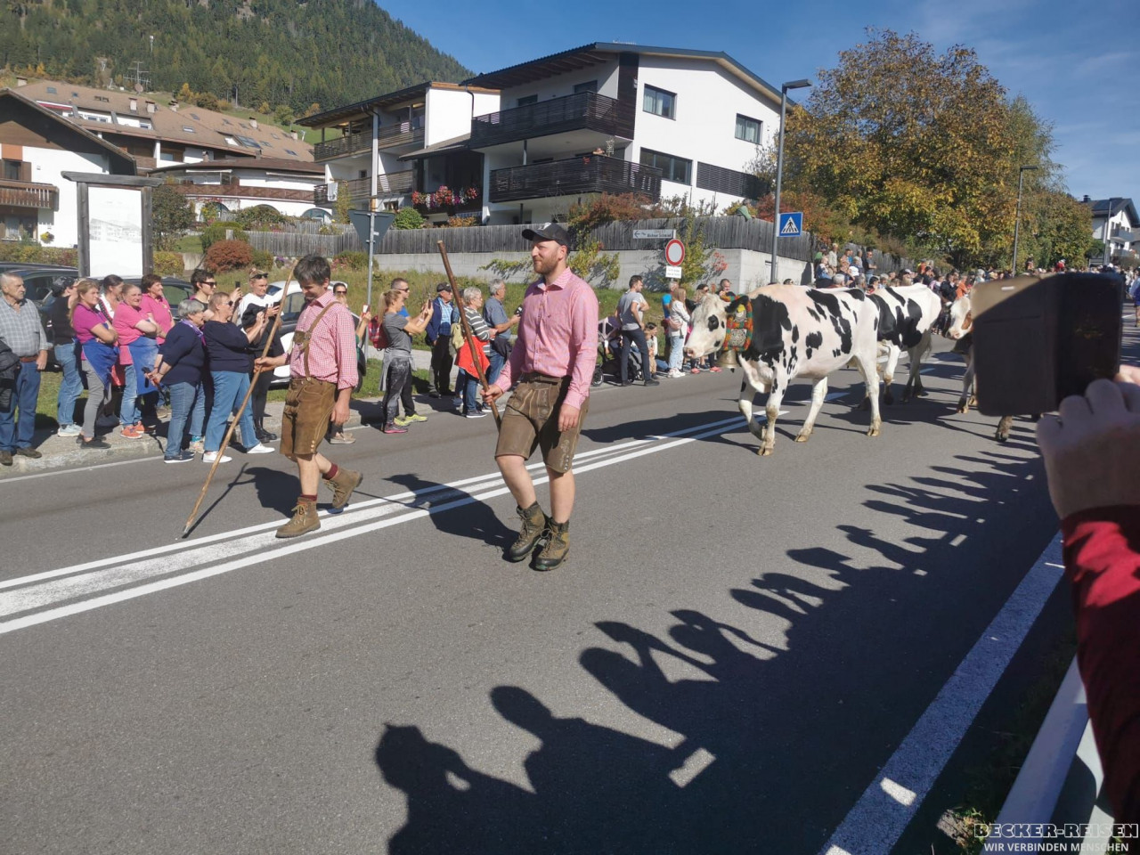 Wenn der Sommer sich verabschiedet und die Sonne das Eisacktaler Hochplateau in warmes Licht taucht, beginnt in Südtirol eine ganz besondere Zeit: die Apfelernte und der Almabtrieb. Unsere fünftägige Becker-Reisen-Tour nach Natz und Terenten stand ganz im Zeichen von Tradition, Genuss und Lebensfreude – und das bei herrlichstem Herbstwetter.