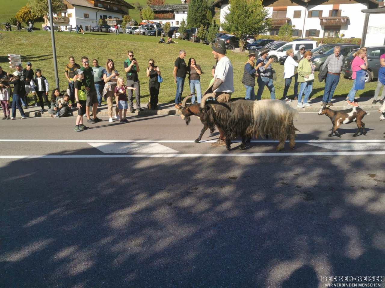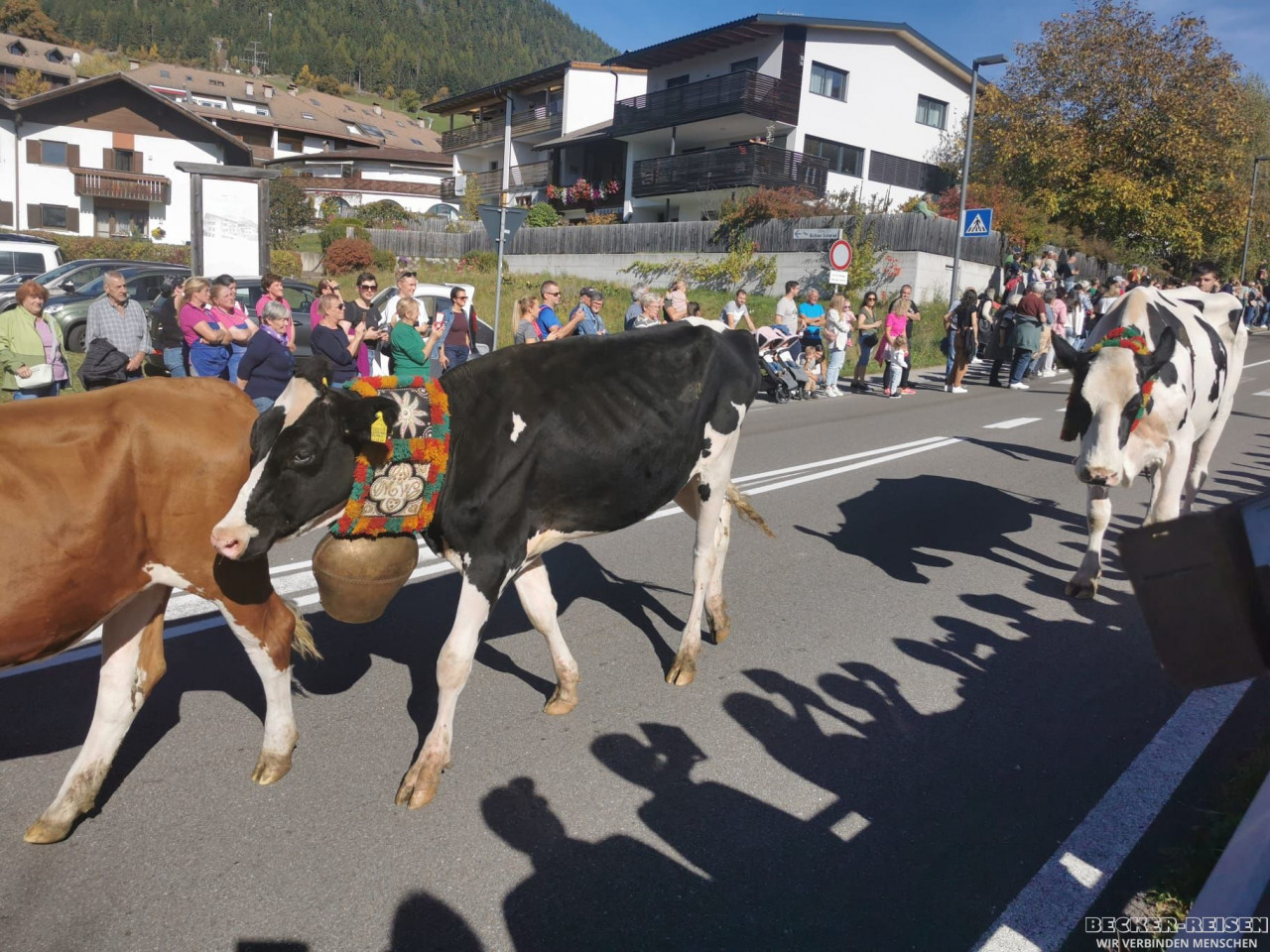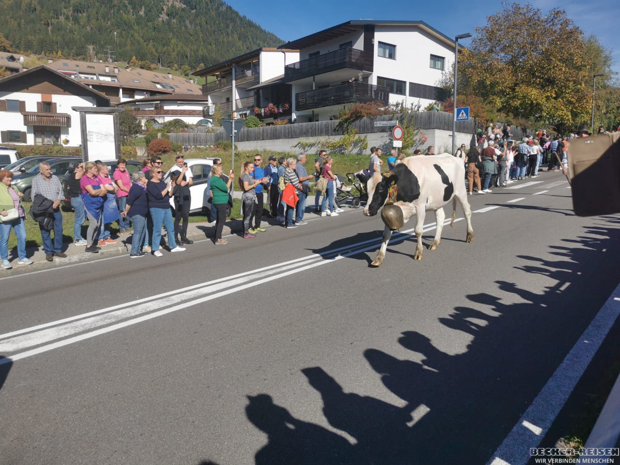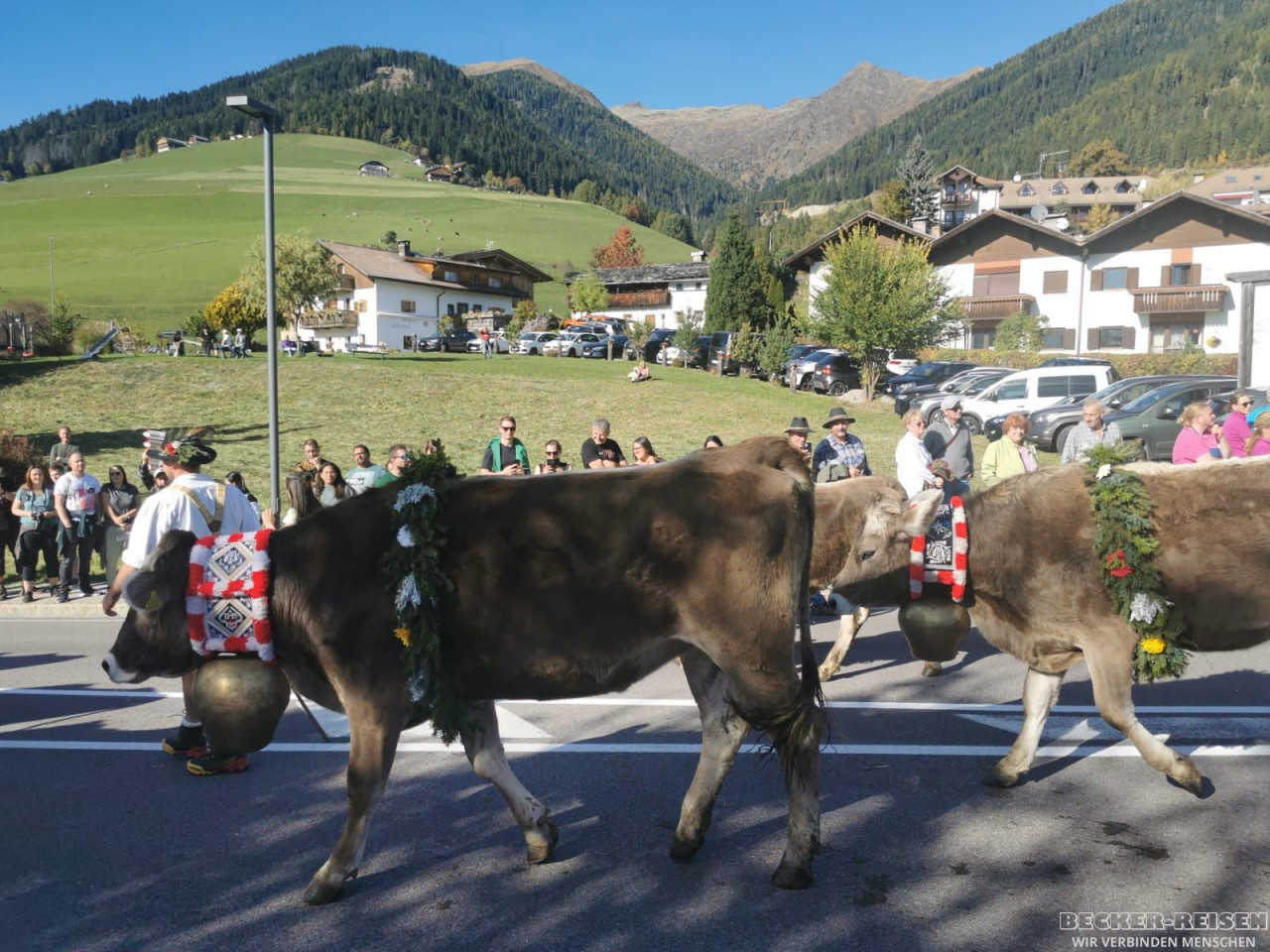 Wenn der Sommer sich verabschiedet und die Sonne das Eisacktaler Hochplateau in warmes Licht taucht, beginnt in Südtirol eine ganz besondere Zeit: die Apfelernte und der Almabtrieb. Unsere fünftägige Becker-Reisen-Tour nach Natz und Terenten stand ganz im Zeichen von Tradition, Genuss und Lebensfreude – und das bei herrlichstem Herbstwetter.