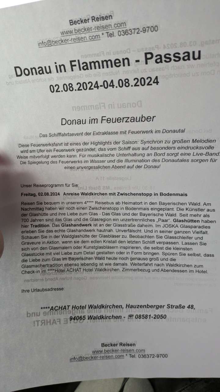 Meine Reise zur Donau in Flammen war ein unvergessliches Erlebnis, das durch die perfekte Organisation und persönliche Betreuung von Becker-Reisen zu einem echten Highlight wurde. Die Kombination aus kulturellen Erlebnissen, entspannenden Momenten und dem spektakulären Feuerwerk hat diese Reise zu einem rundum gelungenen Erlebnis gemacht. Ich kann diese Reise nur jedem empfehlen, der sich nach einer gelungenen Mischung aus Entspannung, Kultur und einem Hauch von Glanz und Glamour sehnt.