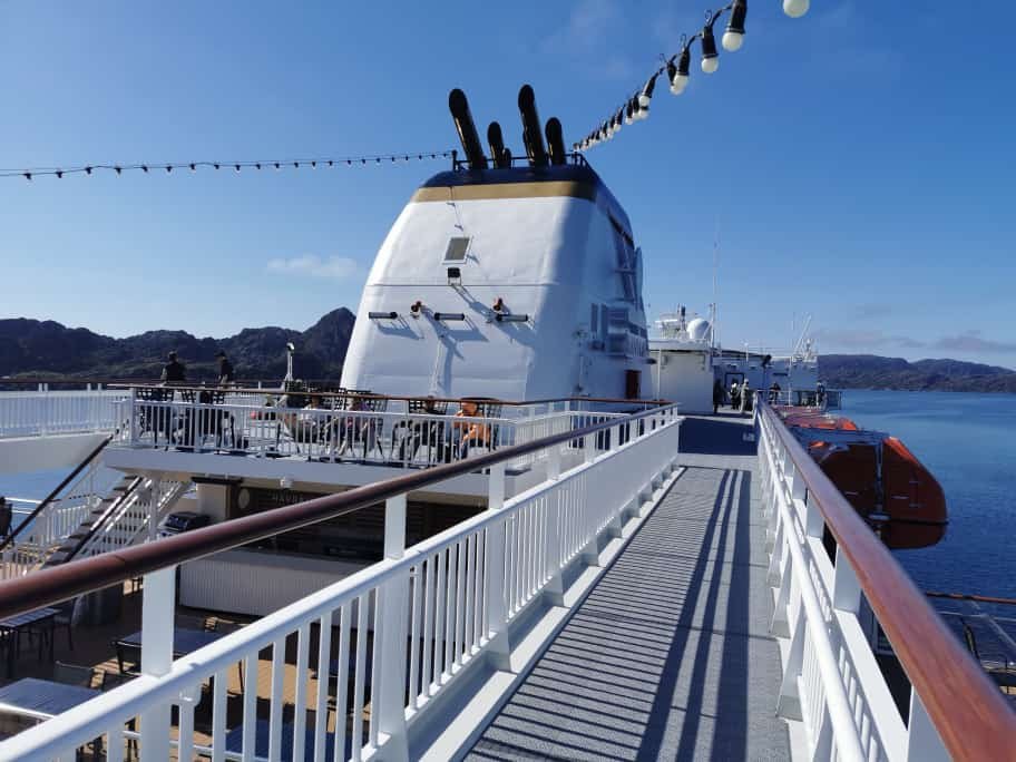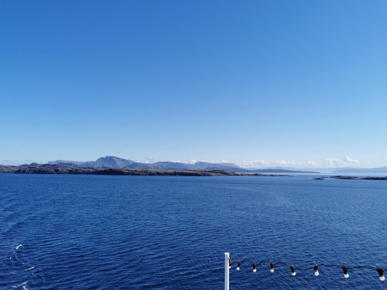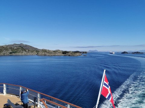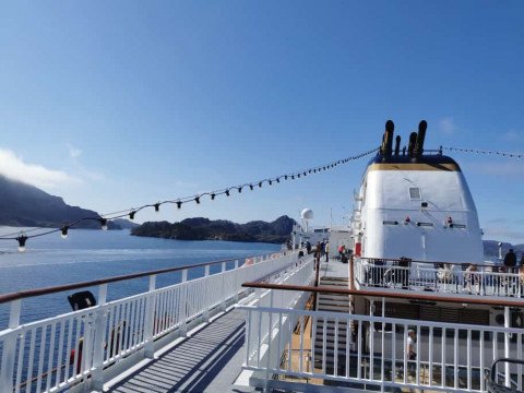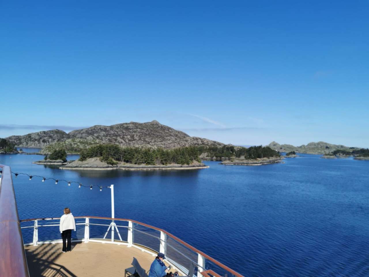 Sonnenschein und Meeresbrise: Perfekte Bedingungen zum RelaxenDas Wetter hätte nicht besser sein können. Der klare, blaue Himmel und die warme Sommersonne luden dazu ein, sich auf dem Deck der Havila Pollux zu entspannen. Viele von uns verbrachten den Vormittag auf den Sonnenliegen, ließen sich die sanfte Meeresbrise um die Nase wehen und genossen die spektakuläre Aussicht. Einige wagten sogar ein erfrischendes Bad im Pool an Bord.