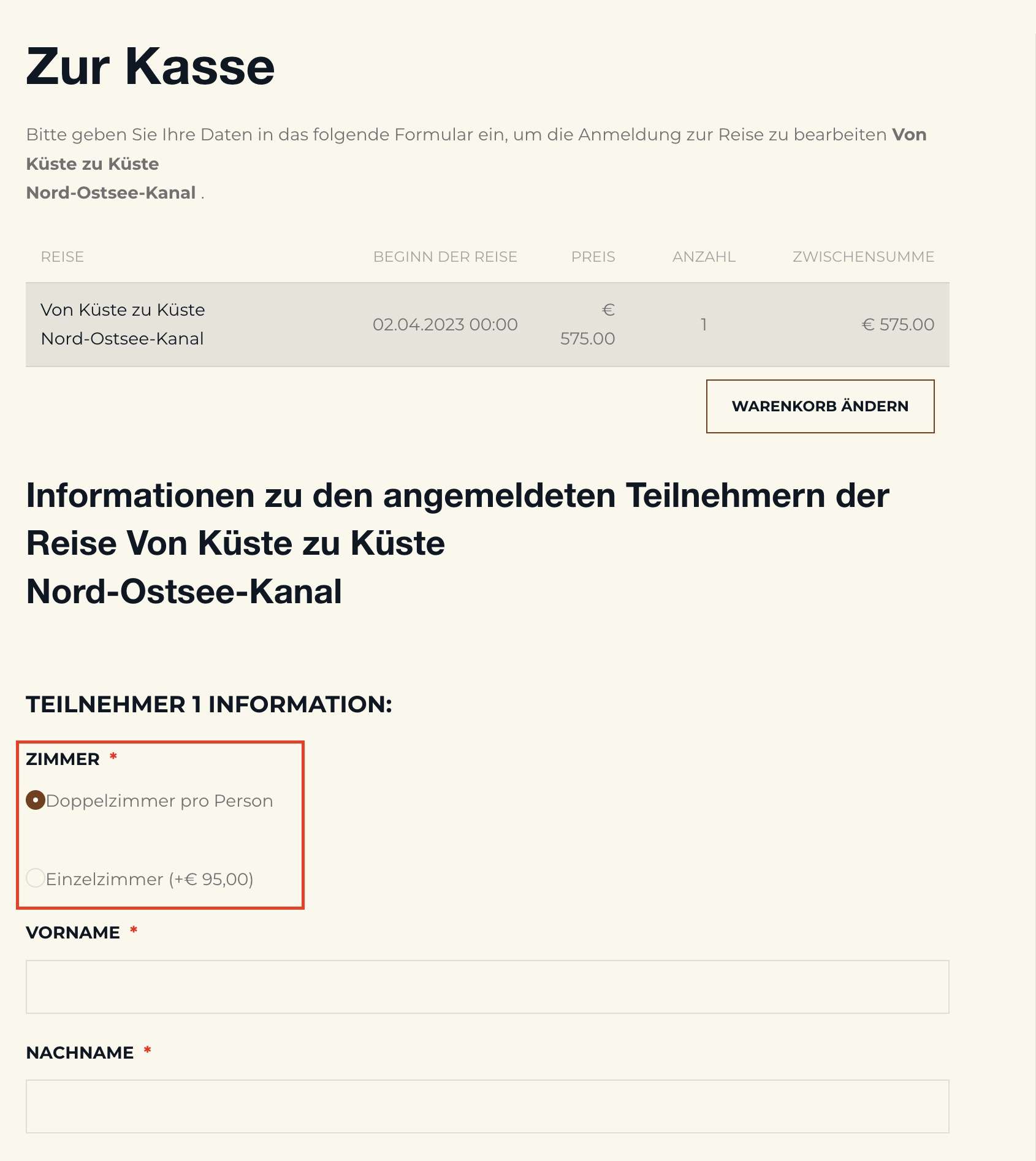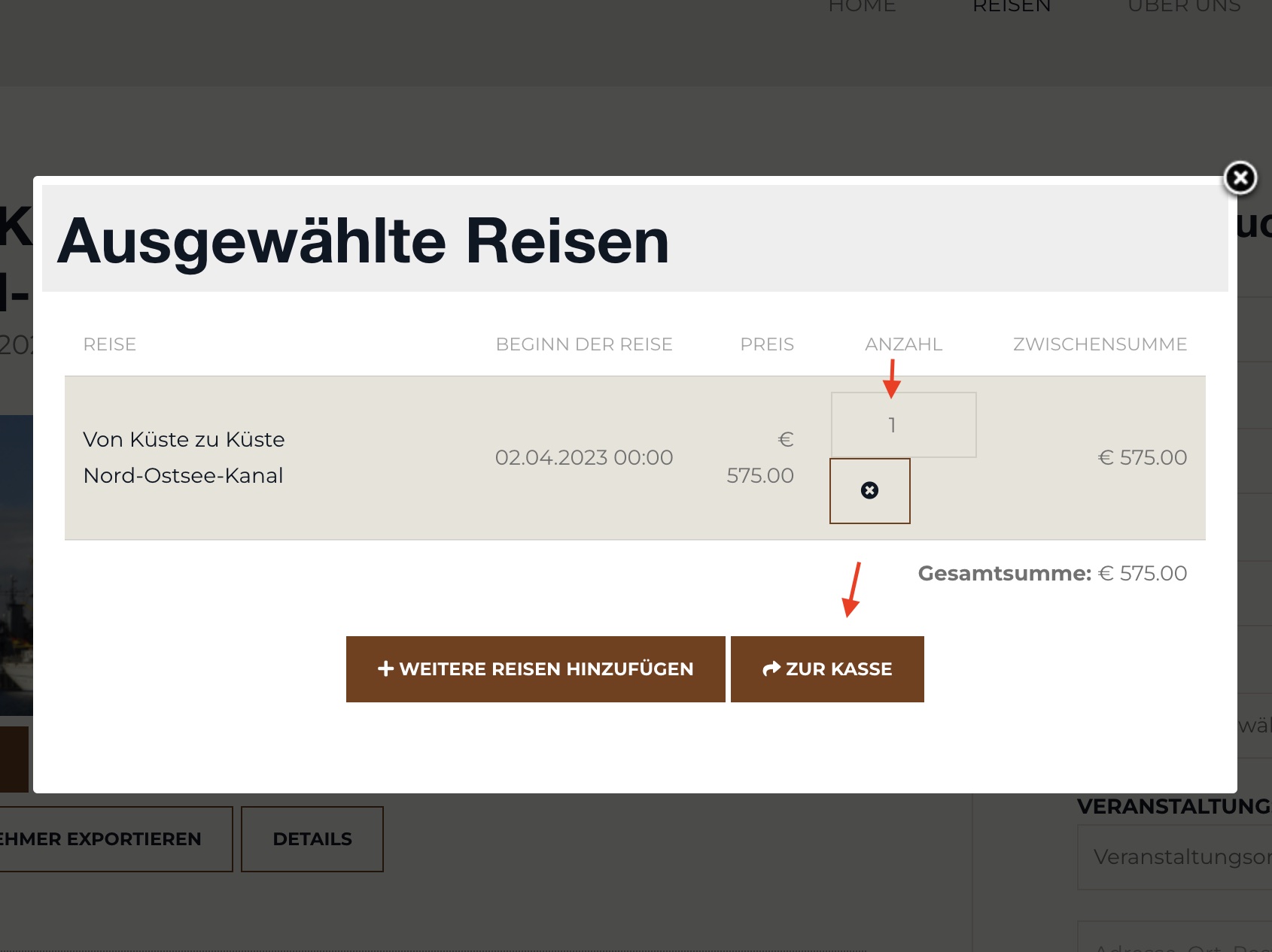 Es öffnet sich ein Fenster, der Warenkorb. Hier sehen Sie Ihre Buchung. An dieser Stelle können Sie auch die Anzahl der Personen, für die Sie buchen möchten, kostenpflichtig verändern.